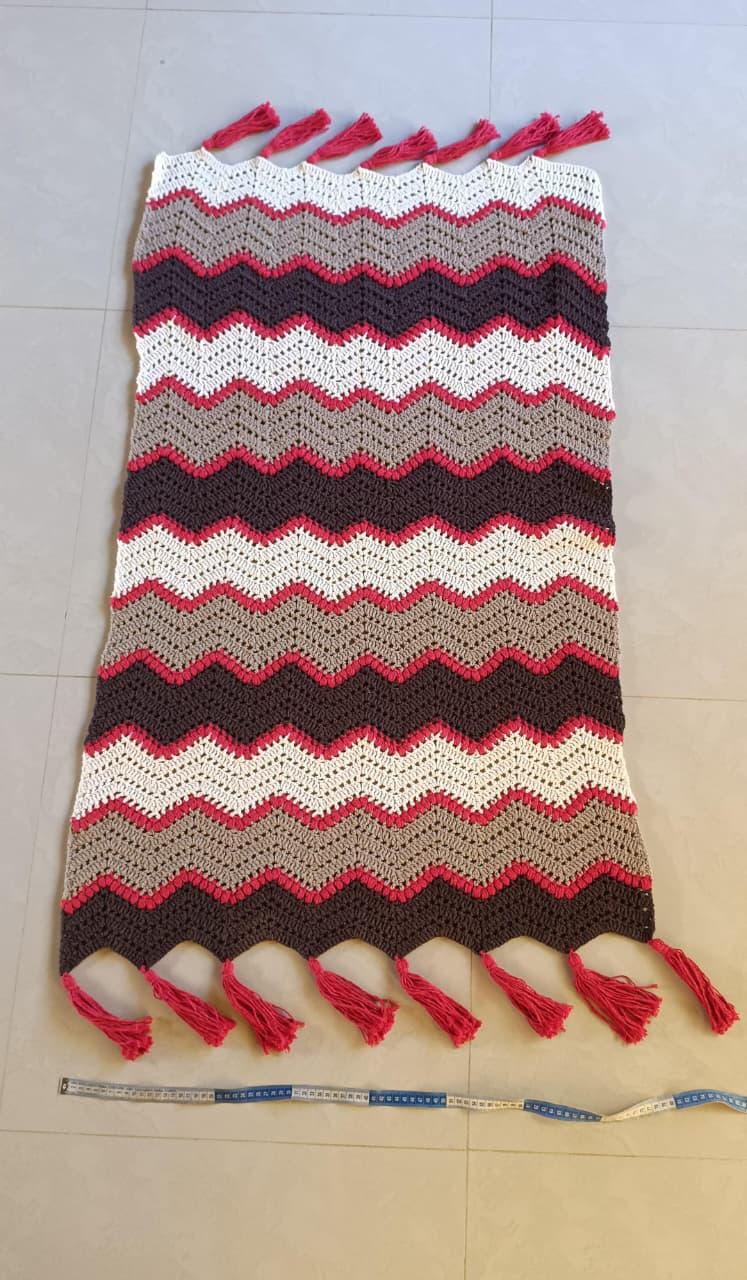 A Manta Chevron em Crochê é confeccionada artesanalmente, trazendo o clássico padrão em ondas (chevron), que cria um visual marcante e sofisticado. A combinação de cores em tons neutros com destaque em vermelho proporciona equilíbrio perfeito entre aconchego e personalidade.