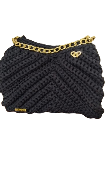 Confeccionada à mão, ponto por ponto, esta bolsa em fio de malha na cor azul petróleo ganha ainda mais sofisticação com sua alça dourada, criando um contraste elegante e marcante.