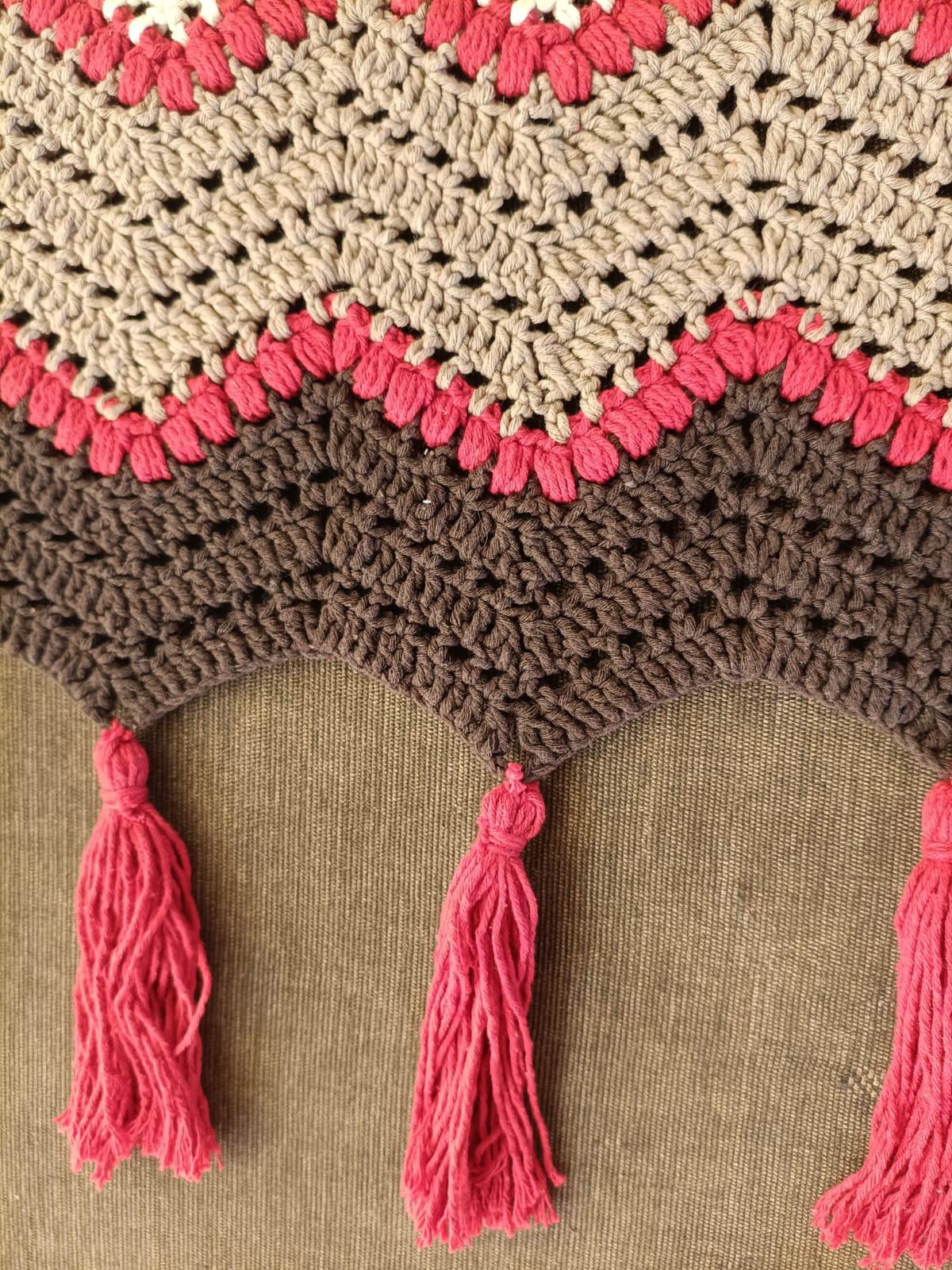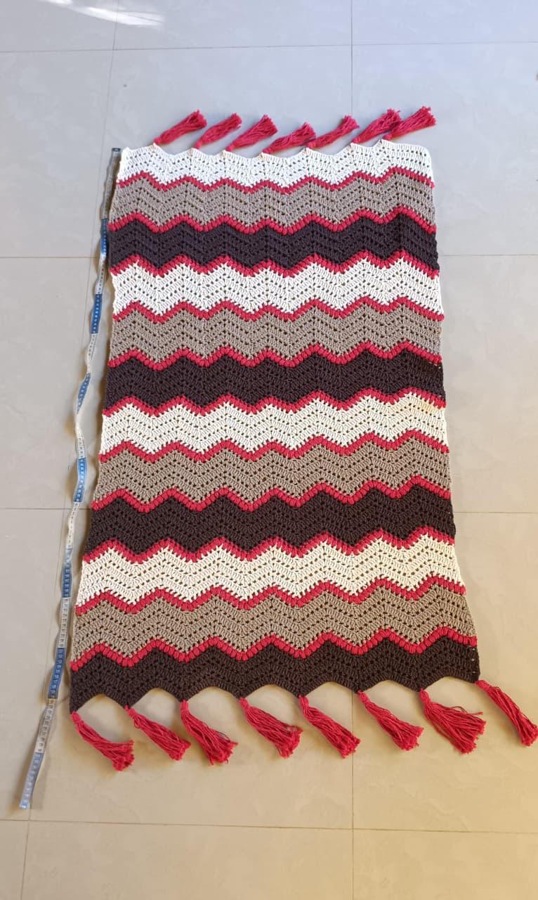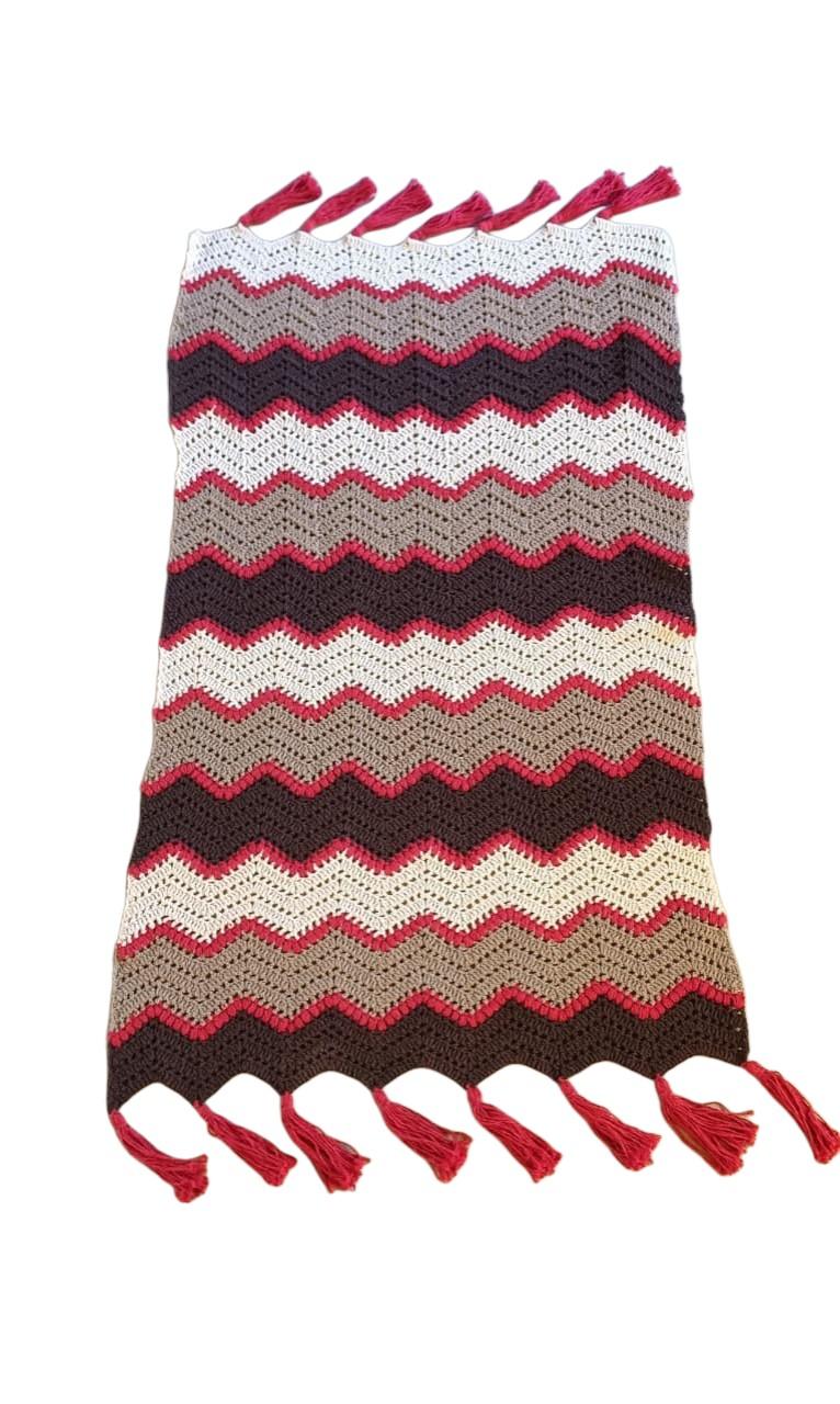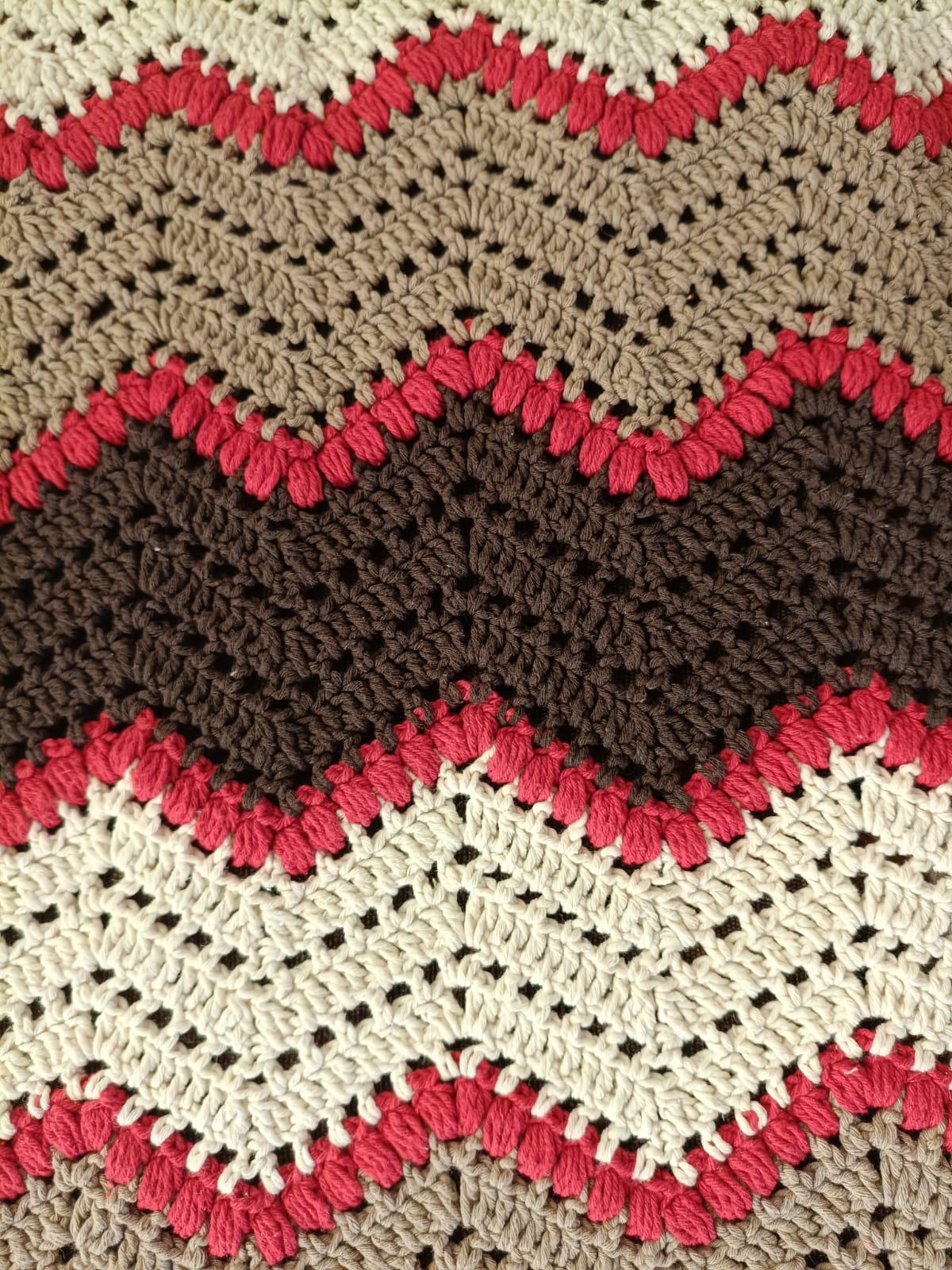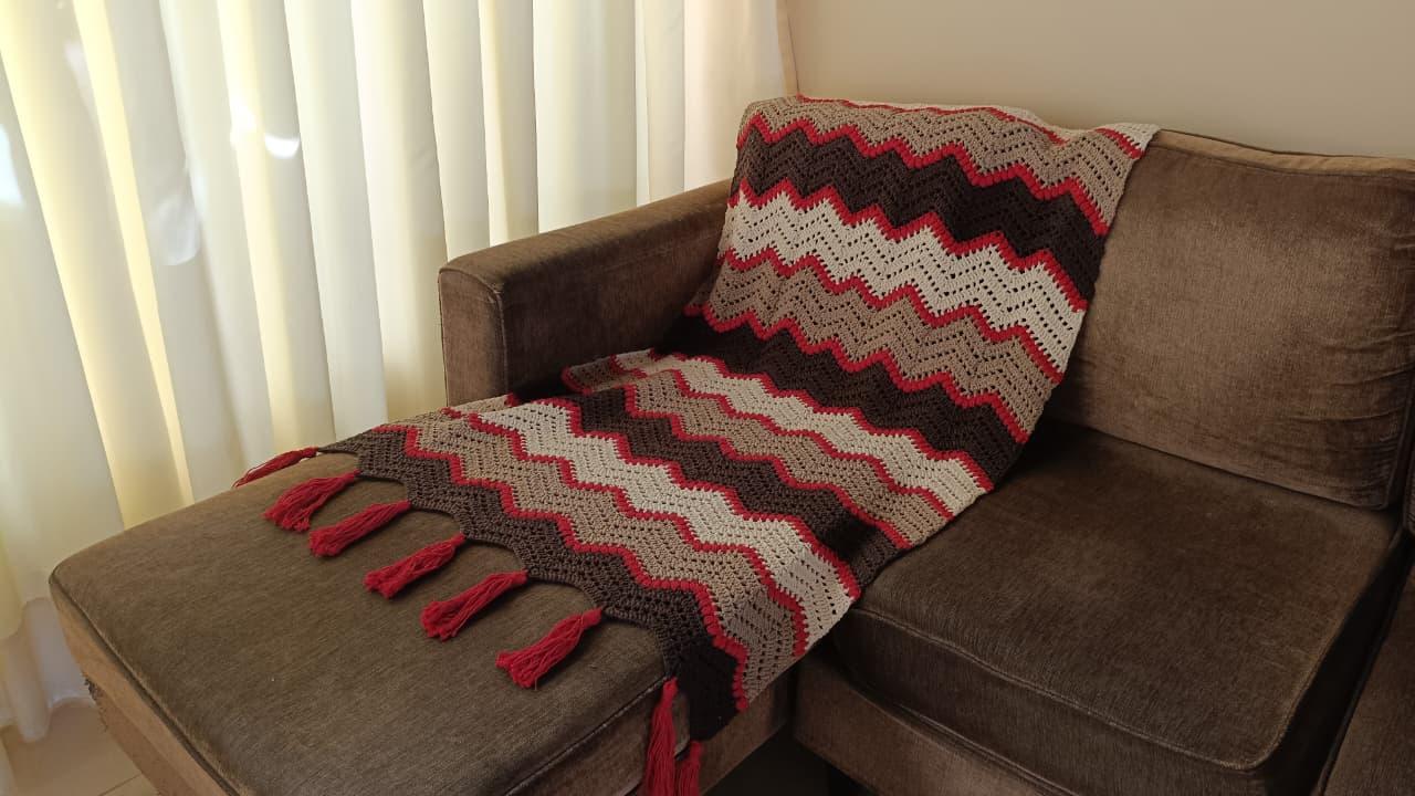 A Manta Chevron em Crochê é confeccionada artesanalmente, trazendo o clássico padrão em ondas (chevron), que cria um visual marcante e sofisticado. A combinação de cores em tons neutros com destaque em vermelho proporciona equilíbrio perfeito entre aconchego e personalidade.